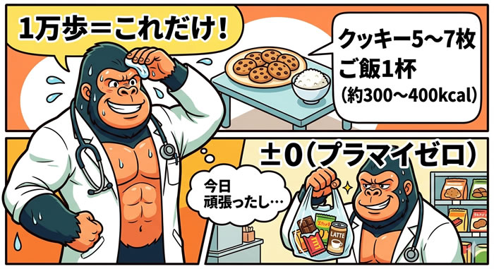 さらに追い打ちをかけます。歩いたあとにコンビニで「今日は頑張ったから」とチョコとカフェラテを手に取った瞬間――はい、ほぼ回収です。